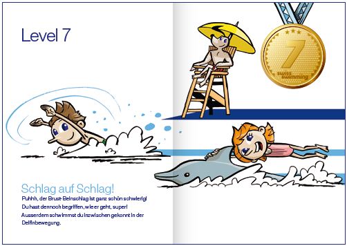 Die Kinder können 15 Meter Delfin mit einem Arm schwimmen, der passive Arm befindet sich in Hochhalteposition. Dabei ist es wichtig, dass der Rhythmus ( zwei Beinschläge pro Armzug ) eingehalten wird. Die Einatmung kann entweder seitlich oder nach vorne ausgeführt werden.